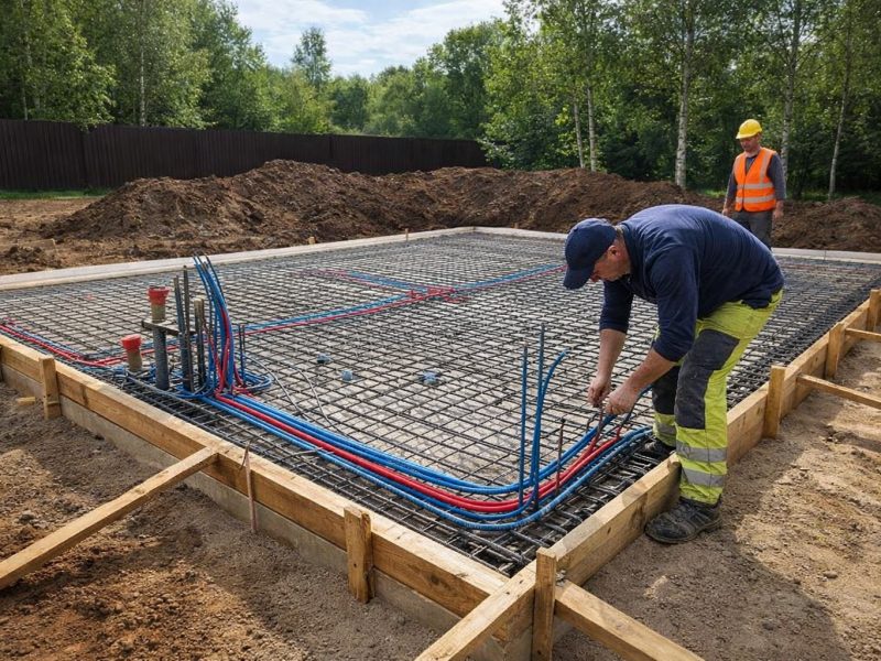 Монтаж включает в себя следующие шаги: подготовка участка, установка изоляции и бетонных плит, создание бетонной рамы, армирование и заливка бетоном. Затем происходит установка вертикальных и горизонтальных арматурных стержней. Дополнительно можно установить теплый пол и подвести водо- и электроснабжение.
