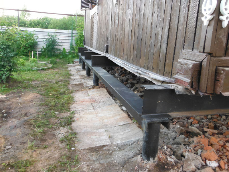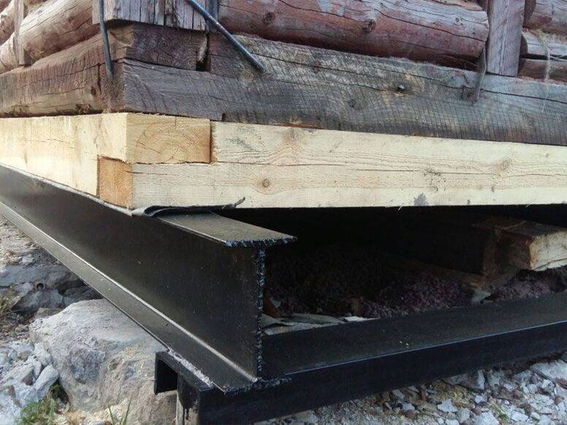 Проводим подъём строения мощными домкратами. Устанавливаем временные опоры, на которые ставится здание. Полностью или частично демонтируем конструкцию старого фундамента.