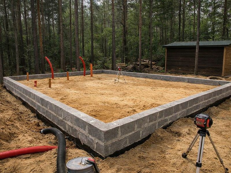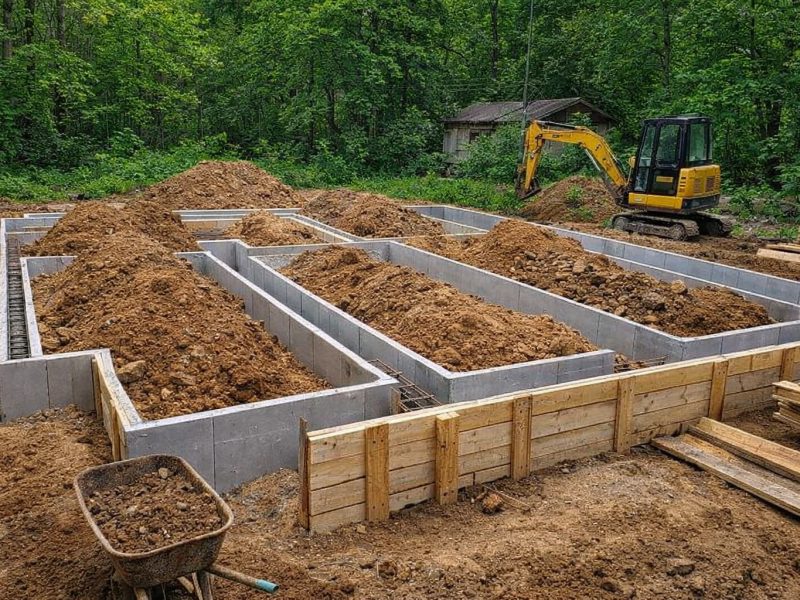 Установка опалубки из прочных досок, которая определяет форму будущего фундамента и служит для удержания бетона во время заливки.